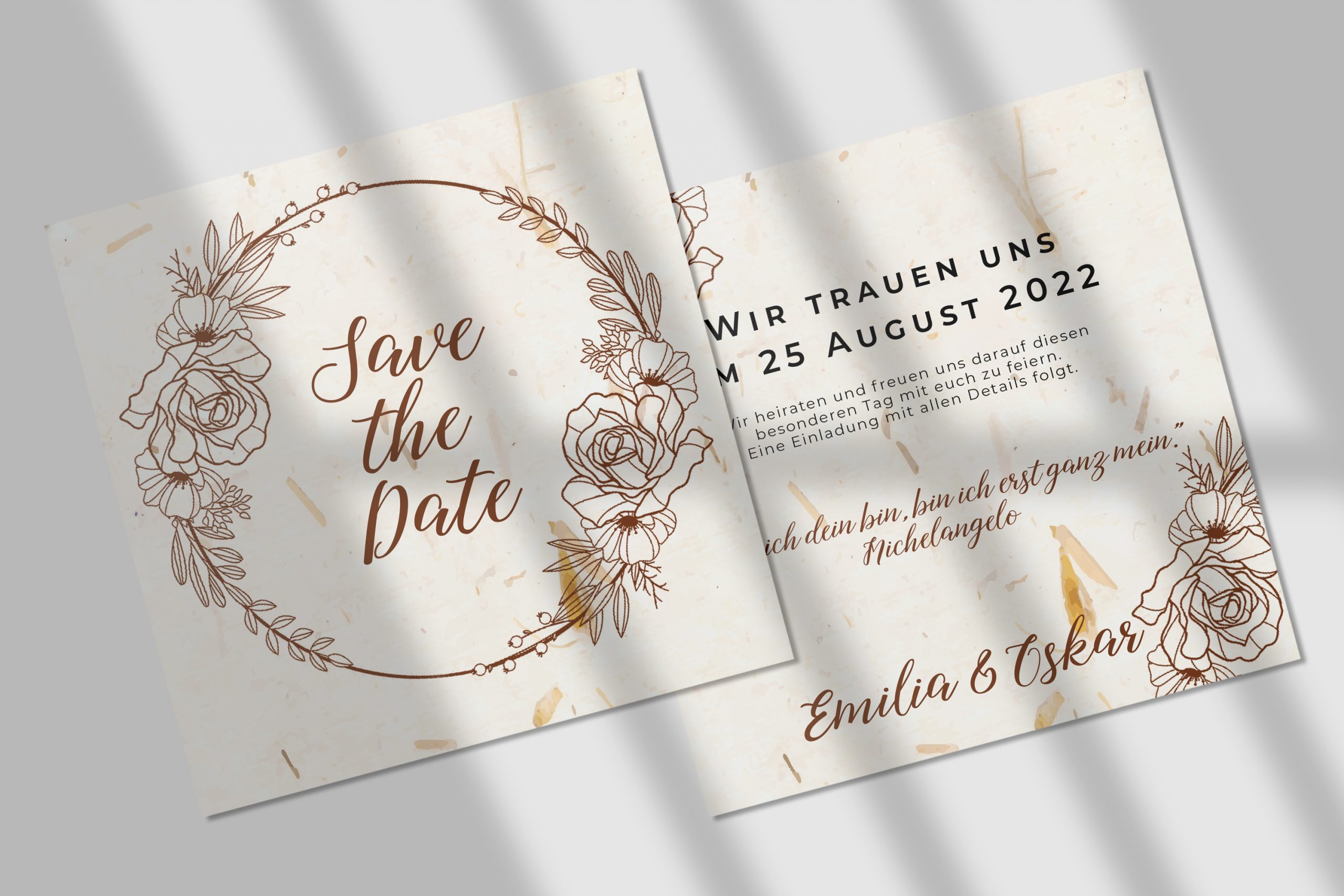 Eine schlichte Save-the-Date Karte mit einem Blumenkreis, der hauptsächlich aus den Umrissen von Rosenblüten und -blättern besteht. Der Untergrund ist beige, aus recyceltem Papier.