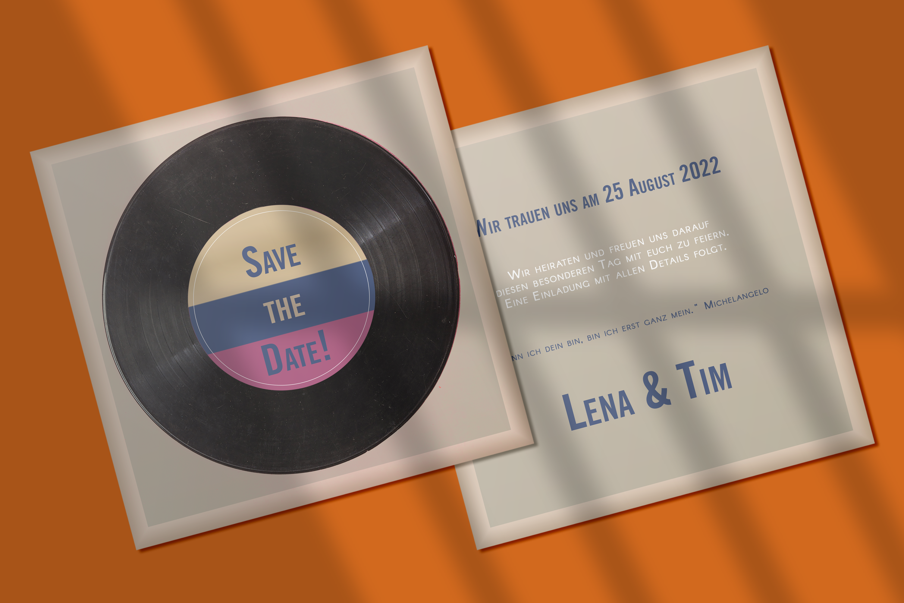 Die Langspielplatte als Motiv der Save-the-Date-Karte ist nicht zum ersten Mal da. Heute kann man den Retro-Stil jedoch modernisieren. Für alle, die sich den Song namens Ehe anhören möchten 🙂